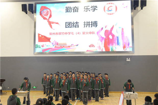 10月13日是中国少年先锋队建队69周年纪念日,是党的十九大、团的十八大召开后的第一个少先队建队纪念日。趁此良机,我校大队委特别举办了“领巾飞扬,做新时代的好队员”的中国少年先锋队建队69周年主题队日系列活动。 “流光飞舞,不忘初心”,10月13日,七年级全体同学,在班主任的指导下走进自己的内心,聆听心中的声音,用他们尚且稚嫩的文笔,在校团委统一准备的信纸上书写对未来的渴望,并将这份写给自己,名为“梦想”的信小心翼翼的封入信封。衷心祝愿他们在今后的岁月中不负韶华、不负初心、得偿所愿。 乐于助人是每位少先队员应有的良好品质。10月14日,翠竹中学的小志愿者们在老师的带领下来到常州图书馆。在图书管理员的指导下,对书架进行了整理,并帮助前来借阅书籍的小朋友们借阅书籍。参与公益事业,培养社会责任感,提高社会实践能力和综合素质,是少先队员成长为担当民族复兴大任的时代新人的先决条件。 10月18日下午第四节课,翠竹中学七年级师生齐聚体育馆,举行建队换巾仪式暨辅导员受聘仪式。翠竹中学丁校长、屠校长,教导处单主任,年级组长周老师莅临现场。迈入中学大门,刻下一圈成长的年轮,在红领巾之歌中,陪伴学生六年的小红领巾被轻轻揭下,取而代之的是鲜红的大红领巾。这是成长的印记,更是同学们成熟的见证。 而在开学以来,在七年级的少先队员中已经有一批优秀的队员们,他们勤奋好学,他们积极进取,他们敢为人先,他们用优异的表现脱颖而出,成为少先队员们学习的榜样。教导处单主任和年级组长周新美老师分别宣读读校杰出少先队员、校优秀少先队员名单并为他们颁奖。随后,秉着争先创优、开拓创新的理念,七年级十个中队展示了他们不一样的风采,在这样优秀、这样友爱、这样进取的中队集体里,同学们一定能勤奋学习,快乐生活,全面发展。 在少先队员的成长的道路上,还有一群亲切可爱、守护我们、关心同学们的人,他们便是中队辅导员老师们。屠校长宣读各个中队的辅导员老师名单,丁校长、屠校长颁发辅导员聘书,十位中队长为辅导员老师佩戴红领巾。随后辅导员老师为同学们送上成长寄语,这份祝福出发,前行的路上,同学们必能披荆斩浪、砥砺前行。身边有优秀的同伴、敬爱的老师,前行路上,还有可亲的学长学姐,优秀团员代表九(9)班李文清与大家分享自己的成长之路,赢得阵阵喝彩。最后,丁校为少先队员们带来了寄语,这是作为一名长者,对祖国未来的美好期望,更是翠竹中学大家庭对每一位家人的殷殷希冀。 青青翠竹,领巾闪耀,火红的队旗照亮了我们的过去;十月金秋,硕果累累,鲜亮的火炬指引我们不懈的努力。最后,在校少先队大队辅导员柏佩婷老师带领大家下一起重温入队誓言。“准备着,为共产主义事业而奋斗! 时刻准备着!”铿锵有力的誓词,是每位少先队员在心中许下的承诺。 飒爽的秋风,吹起胸前的领巾,吹响每位少先队员心中的梦想。(文:张玙)