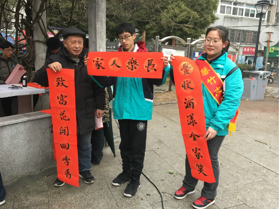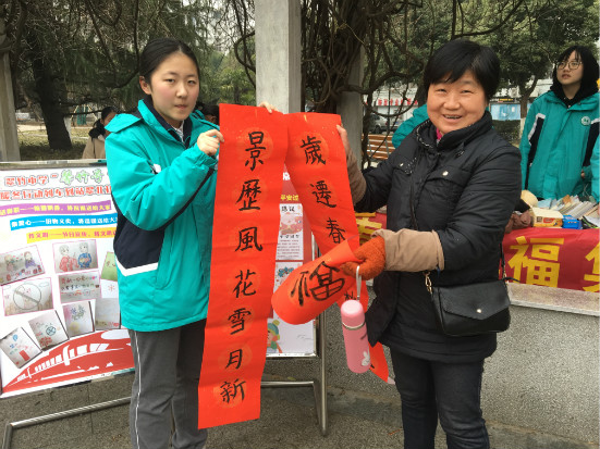 烟雨蒙蒙,爱心浓浓,凛冽的寒风挡不住志愿者们服务的热情,1月28日下午,常州市翠竹中学的30多名小小志愿者们来到翠竹社区北广场,为社区的居民们送上一份丰厚的新年大礼包。 翰墨飘香,祝福礼包 迎新春,送春联,是馨竹志愿者暖冬行动的一项传统服务项目。孩子们挂着兴奋又紧张的笑容,大笔挥毫,龙飞凤舞,一幅幅洋溢着新年喜气的春联跃然纸上。“喜居宝地千年旺福照家门万事兴”“梅传春信寒冬去,竹报平安好日来”……厚厚的一叠红纸上浸满了我们浓浓的节日祝福。虽然冒着细雨,但寒风下志愿者们顾不上微微冻红的小手,认真书写的模样、稚嫩却工整的字迹,那一幅幅红彤彤、散发浓浓墨香的春联,得到了过往居民的阵阵夸赞与好评。 以旧换心,爱心礼包 节约资源,让爱循环,为了向更多市民传递低碳环保的理念,为了帮助更多有需要的弱势群体,小志愿者们将募集而来的旧物、旧书、旧衣进行爱心义卖。他们热情高涨,使出浑身解数,有的大声吆喝,有的高举宣传画四处叫卖,有的拿着物品到处推销,略带稚嫩的嗓音,传播着爱心的宣言。一元、五元、二十元、五十元……一点一点善款的累计,志愿者们获得的不仅仅是金钱上的满足,更是一份帮助他人的成就感与满足感。 文明过节,幸福礼包 文明过节,环保常州。值此新春,小志愿者们制作了精美的海报,积极向过往居民和店铺宣传倡议:文明过节,节俭过节,平安过节。 让爱传承,让爱浸润,让爱奔涌,让爱绵延,在市学生志愿者联盟的号召下,我校的馨竹志愿组织将进一步延续爱心行动,将美好传递到更多的远方!