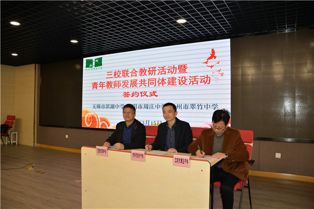 三月暖阳拂人心,贵客盈门满堂辉。3月15日常州市翠竹中学、无锡市滨湖中学、江阴市周庄中学的领导和老师们齐聚翠竹中学过渡校区,共同参加三校联合教研活动暨青年教师发展共同体建设活动。 吴栋校长代表学校致欢迎词,欢迎远道而来的同行者们。他表示青年教师这个团队需要成长共同体这个助推器来助力成长,希望通过三校联盟搭建一个经验交流的平台、一个展示自我的舞台,打造一个携手共进的青年教师团队。在热烈的掌声中,三校领导郑重签署了青年教师发展共同体约定。希望的在未来的时间里,一群同行者,逐梦远航。