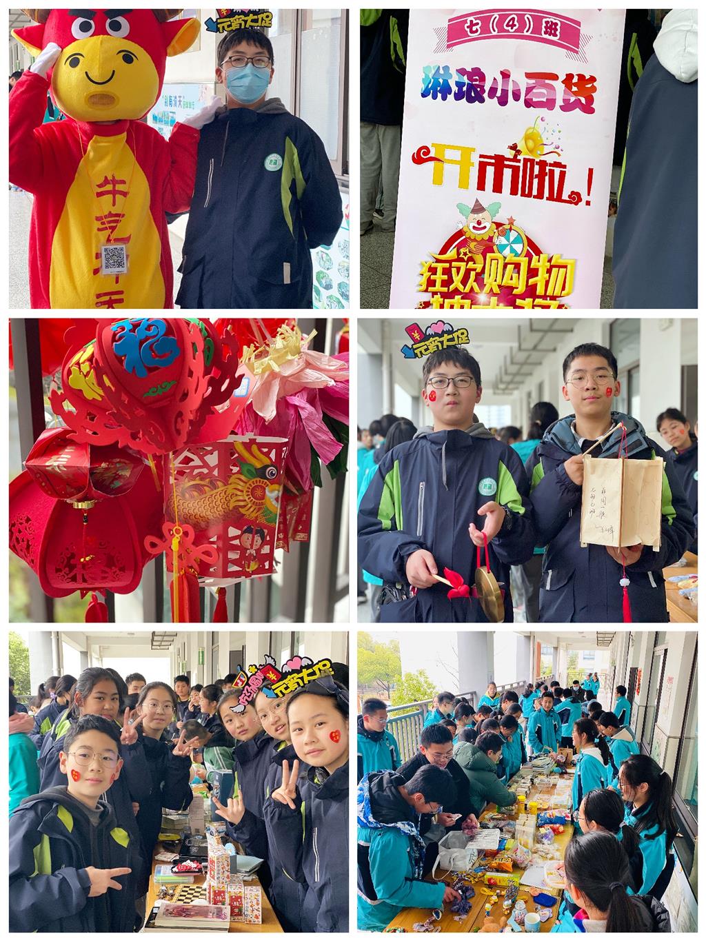 “火树银花合,星桥铁锁开。”又是一年元宵节,火红的花灯,喧嚷的街市,闹出一个温馨团圆的元宵,常州市翠竹中学一年一度的元宵灯会暨爱心义卖活动也紧锣密鼓地开展起来。 楼梯、走廊上早早就挂满了学生手制灯笼,红红火火,每只灯笼下都有一个灯谜,元宵当天猜出答案即可兑换精美奖品。 元宵当天各班门前贴上义卖宣传海报,进行活动预告。第六节课下课,各班义卖物品便在走廊陈列开来。人潮涌动,芬芳四溢。棉花糖、关东煮、寿司、奶茶、元宵……各式小吃纷纷上阵,家长学生各显神通,现场制作更是吸引无数顾客。 除了兜售闲置物品,飞镖、盲盒、保龄球、扎气球、抽奖……各类精彩纷呈的小游戏也成为了本次义卖活动一大亮点,还有学生现场作画贩卖。活动组织得井井有条,学生也逛得津津有味。 最吸引眼球的是七(7)班的两只“大红牛”。学生套上牛形人偶装,在各班游走,兜售货物,另有两人提手作灯笼与小锣,吆喝着贩卖物品。 最后,各班清点义卖善款悉数上交,活动圆满落下帷幕。本次义卖活动内容丰富,形式多样,在给学生带来乐趣的同时,也在实践中锻炼了学生的能力。春晖熠熠,馨光暖暖。翠中学子在这个美好的日子里将智慧化为爱心,将辛劳散作春晖,照亮生命的每一个角落。