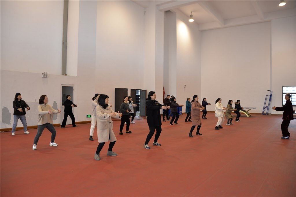 33日开始每周三和周四上午9:30-10:30,学校组织全体教工在体育馆学习太极。聘请原江理工体育部主任曾红卒教授来校,教授太极拳中的“八段锦”“二十四式”“五禽戏”等内容,分享“太极”之乐,促进教工强身健体,丰富教工文体生活。