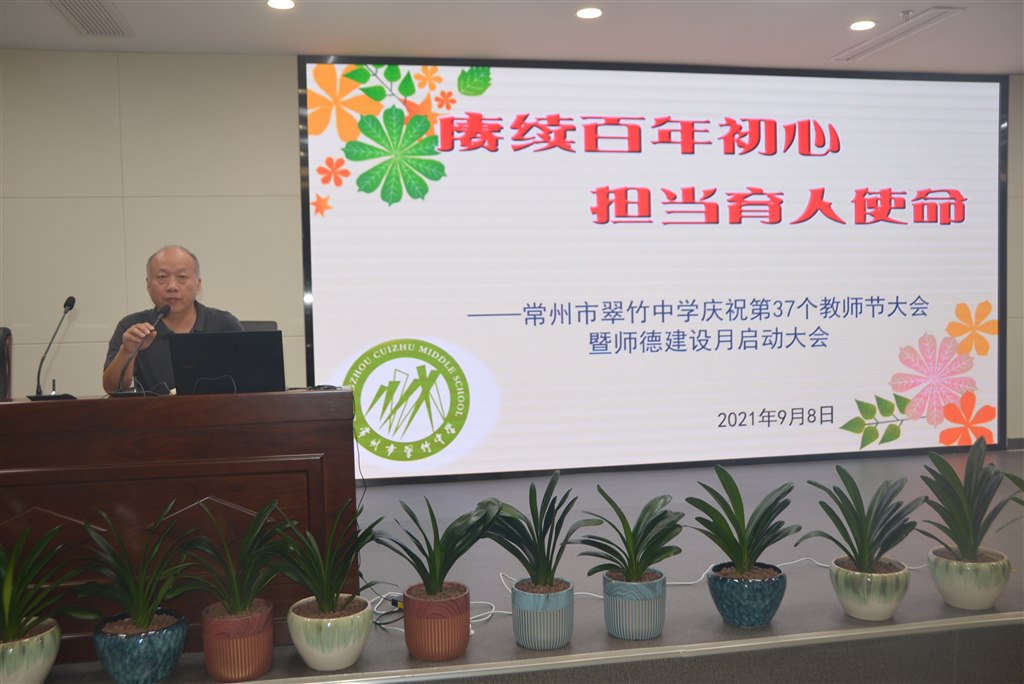 百年初心不移,肩负育人使命。在第三十七个教师节即将来临之际,9月8日下午,常州市翠竹中学召开庆祝第三十七个教师节教工大会暨师德建设月启动会。会议由校工会朱江主席、教师发展处陈丽主任主持。 “清竹”守心,担当使命 会议伊始,一段视频带领着全体教工重温了张桂梅的事迹。时代楷模张桂梅扎根乡村教育40余年,燃烧自己,照亮学生的人生梦想,是教师们学习的榜样。 在翠中校园里也有很多师德高尚的老师。或是30年如一日勤勤恳恳地教书育人;或是热情仁爱,像妈妈一样关怀学生;或是无私奉献,主动接济贫苦学生……身边的楷模令人钦佩。陈文伟校长为获得2021年“常州市师德模范”称号的周泓涤老师颁发奖状。 随后,朱江主席介绍了师德师风建设月的相关安排,周贵兴做“师德师风建设”动员讲话。周书记表示,翠中的教师要牢记三个要点:对党忠诚、爱生如子、执着奋斗。他强调,教师要坚持为国育才、为党育人的导向,要保持高度的政治站位,重视并贯彻五育融合,从身边小事落实对学生的劳育与食育。 “青蓝”共美,薪火相传 大道无言,铸魂立德。2020学年,青年教师们用奋斗诠释了青春最美的模样,陈丽主任对过去一学年潜心奋斗的青年教师予以鼓励,陈校长、周书记为他们颁发奖状。 青年教师的成长离不开前辈的呵护与帮助,离不开师长的引领与助推,离不开学校搭建的“青蓝结对”工程。优秀师徒代表刘卫平老师与叶红老师上台分享一年来的结对经验。 刘卫平老师肯定了叶红老师的谦虚好学,赞扬了她较高的领悟能力及创新意识。叶红老师对刘卫平老师一年的指导与帮助表达了真挚的感谢,并总结自己悟出的道理:吃透教材、注重实效、不断学习。 新竹高于旧竹枝,全凭老干为扶持。新的一学年中,学校教师群体又迎来了新鲜的血液,为了更好地帮扶青年教师,又有一批经验教师与青年教师结成了师徒关系。本着自愿和推荐的原则,本学年学校共结对了14对教学师徒,陈主任宣布了本学年教学师徒结对的名单。新徒弟代表张滢钰老师发言,并带领全体青年教师宣誓。铮铮誓言中,是对教育教学的责任与担当。 师如君子,幽幽其香,青蓝相继,匠心永承。愿全体教师不忘党的初心,肩负时代使命,青蓝相继逐未来,亦师亦友承匠心。 撰稿:张慧琳 拍摄:田盈 审核:朱江、陈丽