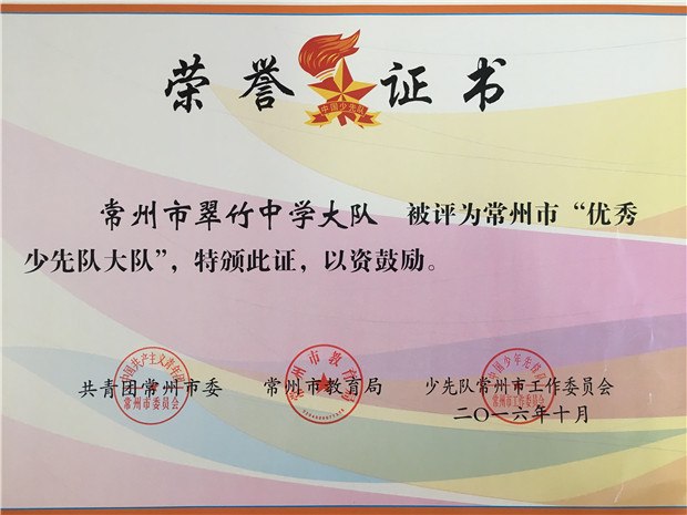 常州市翠竹中学大队被评为常州市“优秀少先队大队”。