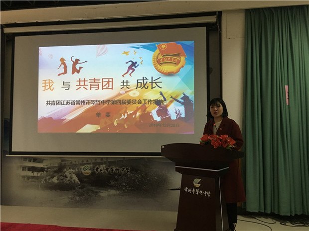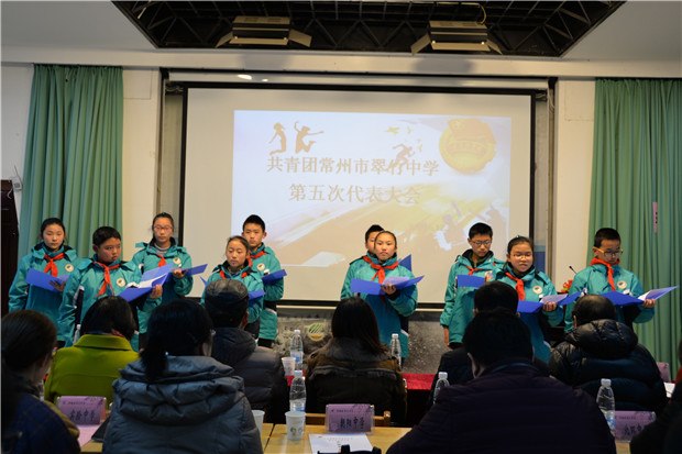 星星火炬,点燃年少的梦想,团旗飘扬,汇聚青春的力量。2016走向尾声,新一年的钟声即将敲响,在此新旧交替之际,翠竹中学隆重举行了共青团常州市翠竹中学第五次团代会,这是学校团工作发展的一座里程碑,也迎来了成长的新起点。出席本次会议的有教育团工委姚奕副书记、兄弟学校团委书记、全体校领导、工会主席,还有部分团员教师代表、68名团员代表及24名少先队代表。
