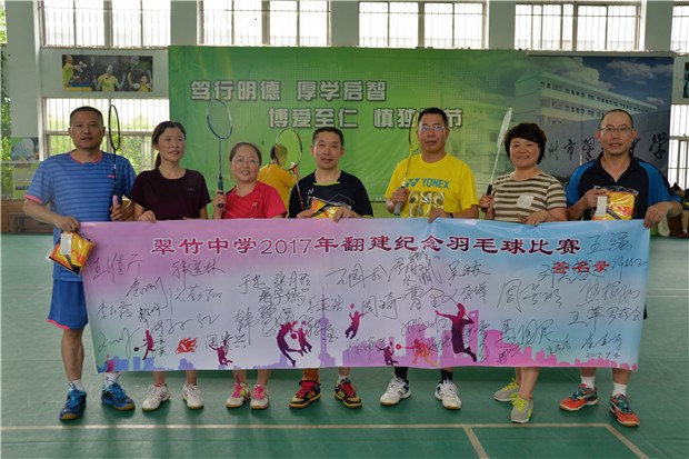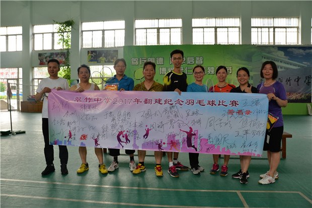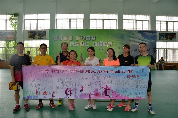 2017年7月4日下午一点半翠竹中学教职工在翠竹中学体育馆举办“翠羽杯”羽毛球纪念赛。本次活动恰逢翠竹中学建校二十周年,在学校即将原址翻建,体育馆即将拆除之际,为了传承学校羽毛球文化,丰富教职工业余生活,特此举办本次纪念赛。   下午一点开始,教职工们陆陆续续的来到体育馆,掩饰不住的是对于羽毛球运动的热爱。本次活动分为三个环节:签名留影、比赛和颁奖。来到场地的所有参赛选手们首先在签名录上留下自己的名字,而后来到场地中间进行大合影。本次比赛分为四组,分别为:吴栋校长带领的明德队,潘亮生校长带领的启智队,路云书记带领的博爱队和周贵兴书记带领的励志队。在本次主裁判余忠教练宣读完对战顺序和比赛规则后,吴栋校长宣布比赛正式开始。 四个组别的队长根据本队以及对方的实际情况进行排兵布阵,比赛开始,四个场地的较量就此拉开序幕。过程中有欢笑有认真有坚韧有顽强,直到下午四点半,比赛正式结束。吴栋校长为每一位参赛选手颁发奖品。比赛或许必有输赢,但是翠中羽毛球爱好者打出一场没有输赢的羽毛球比赛。    七月是翠中中学翻建的开始,球馆也将拆除,但翠中的羽毛球爱好者们一直在这里,为着心中的热爱,为着心中的情怀!七月我们不说再见,这就是羽毛球运动的魅力。