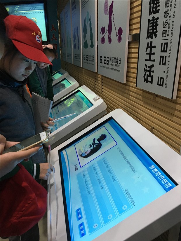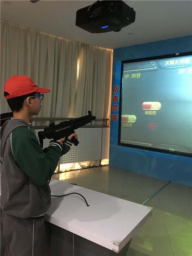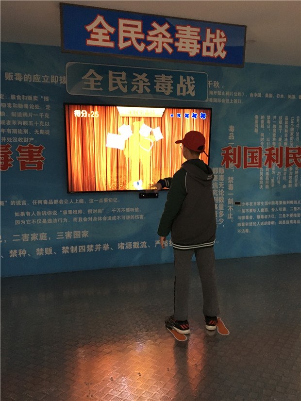 毒品知识知多少?在楼下的互动游戏厅,开启了毒品知识闯关模式。“全民杀毒战”,利用高科技热感应技术在电视机上模拟切水果游戏,将不同的毒品一一切碎;“灭毒大作战”,模拟射击游戏,将常见药品与毒品、缉毒警察与毒贩等区分,力求消灭毒品毒贩;“禁毒知识作答”,选择题的形式迅速反映禁毒相关知识,在玩中学,在学中记,枯燥难懂的禁毒知识变得有趣!